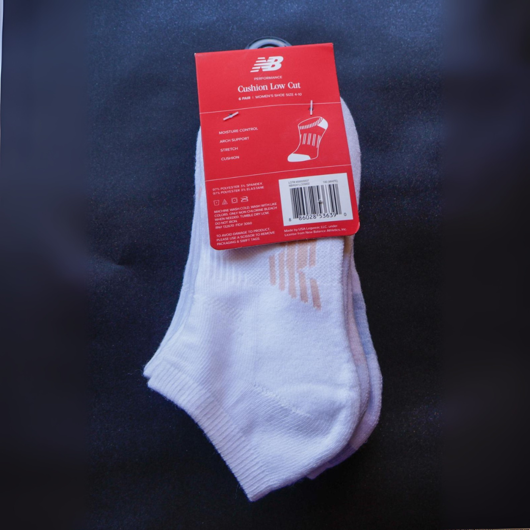 Paquete de 6 pares de medias de mujer en color blanco con detalles rosados, de la marca New Balance (Accesorios).